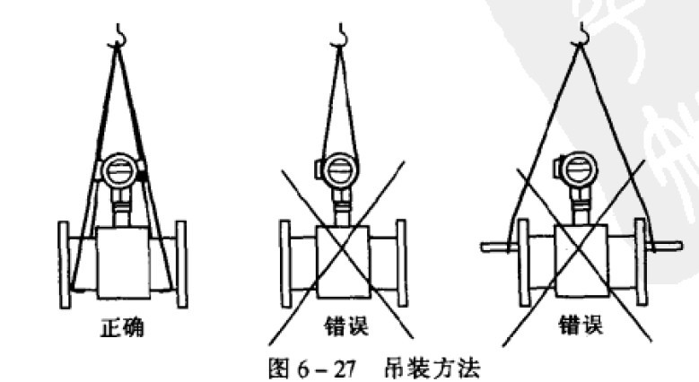 在搬運和吊裝傳感器時,應該將吊索套在傳感器兩端的頸部位置或吊環(huán)上,切勿在測量管內套人管棒進行吊裝,以免損壞襯里(見圖6 - 27)。在吊裝和搬運過程中,必須防止傳感器襯里和接線盒受碰撞而損壞。