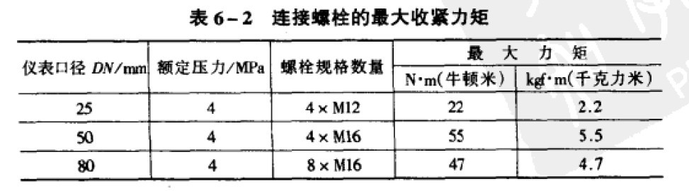 眾所周知.PTFE(冷態(tài))在壓力之下會(huì)變形。電磁流量計(jì)在安裝時(shí),法蘭螺栓不可無(wú)限制地任意擰緊。如果螺栓擰得過(guò)緊,則PTFE蠕變會(huì)使法蘭連接處發(fā)生滲漏,因此連接螺栓應(yīng)該使用力矩板手上緊,連接螺栓最大收緊力矩應(yīng)按制造廠說(shuō)明書(shū)規(guī)定;表6-2為一例,可作參考。