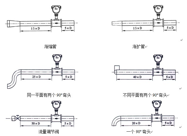 為了保證準(zhǔn)確的測(cè)量,流量計(jì)的上游必須有足夠長(zhǎng)的直管段,上游流動(dòng)分布盡可能不受干擾,如果有控制和節(jié)流裝置最好裝在下游。直管段長(zhǎng)度用管道內(nèi)徑D的倍數(shù)來(lái)表示,上下游最小的直管段要求如下: