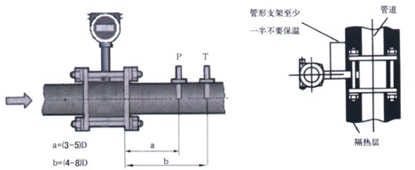 ? PT100鉑電阻應(yīng)安裝在流量計(jì)下游4~8D處(如圖7所示),在選好的位置上開(kāi)一個(gè)25mm圓孔,把鉑電阻底座垂直或傾斜焊在開(kāi)好的圓孔上,把鉑電阻裝在底座上并確保密封可靠無(wú)泄露。
