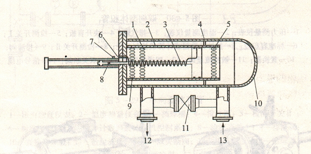 7-檢測開關;8-觸發(fā)標記;9-制動孔;10-外缸體;11-旁通閥;12-出口;13-入口