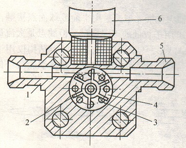 圖2切向式渦輪流量傳感器1-入口;2-切向葉輪;3-孔;4-葉輪室; 5-出口;6-磁電轉(zhuǎn)換器