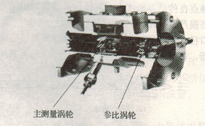 渦輪完全不相連接,實(shí)際相當(dāng)于將兩臺渦輪流量計裝在一個表體內(nèi)。由于參比渦輪螺旋角小,不驅(qū)動計數(shù)機(jī)構(gòu),軸承采用強(qiáng)固的陶瓷滾珠和永久性密封潤滑,因此可看作為一臺高可