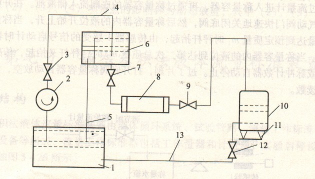 8一試驗(yàn)管路;9-流量調(diào)節(jié)閥;10-容器;ii-衡器;12-放水閥;13 -回水管