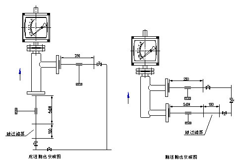 流量計(jì)垂直安裝,流量計(jì)中心線與鉛垂線的夾角不超過5°,在流量計(jì)的上游須保證五倍公稱通徑的入口直管段,下游保證250mm出口直管段。如果介質(zhì)中含有固體雜質(zhì),應(yīng)在流量計(jì)上游加裝過濾器;如果介質(zhì)中含有鐵磁性物質(zhì),應(yīng)在流量計(jì)的上游安裝磁過濾器。為了便于維護(hù)和清洗且不影響生產(chǎn),建議安裝旁通管路。為了避免由于管道引起的流量計(jì)變形,安裝法蘭必須與儀表同軸并且相互平行,并適當(dāng)?shù)刂喂艿酪员苊夤艿勒駝雍蜏p小流量計(jì)的軸向負(fù)荷,測量系統(tǒng)中控制閥應(yīng)安裝在流量計(jì)的下游。用于測量氣體時(shí),應(yīng)保證管道壓力不小于5倍流量計(jì)的壓力損失,以使浮子穩(wěn)定工作。