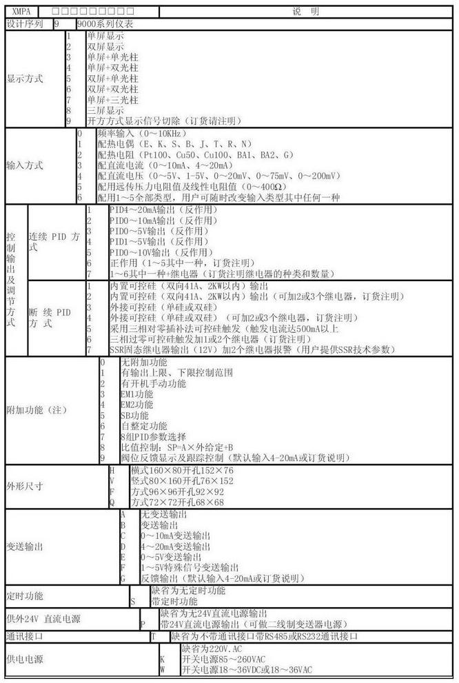 XMPA-9000智能PID調(diào)節(jié)儀選型表: