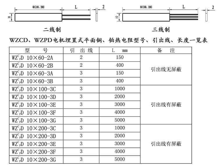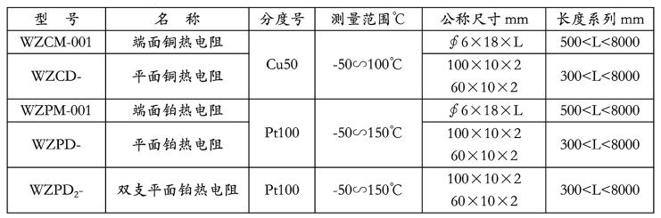 注:表格所列WZCPD- 平面銅、鉑電阻公稱(chēng)尺寸為長(zhǎng)×寬×厚。